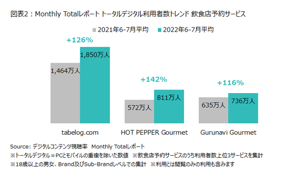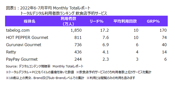 - - 飲食店予約サービスのトータルデジタルでの月間利用者数は、tabelog.comが最も多く1,850万人