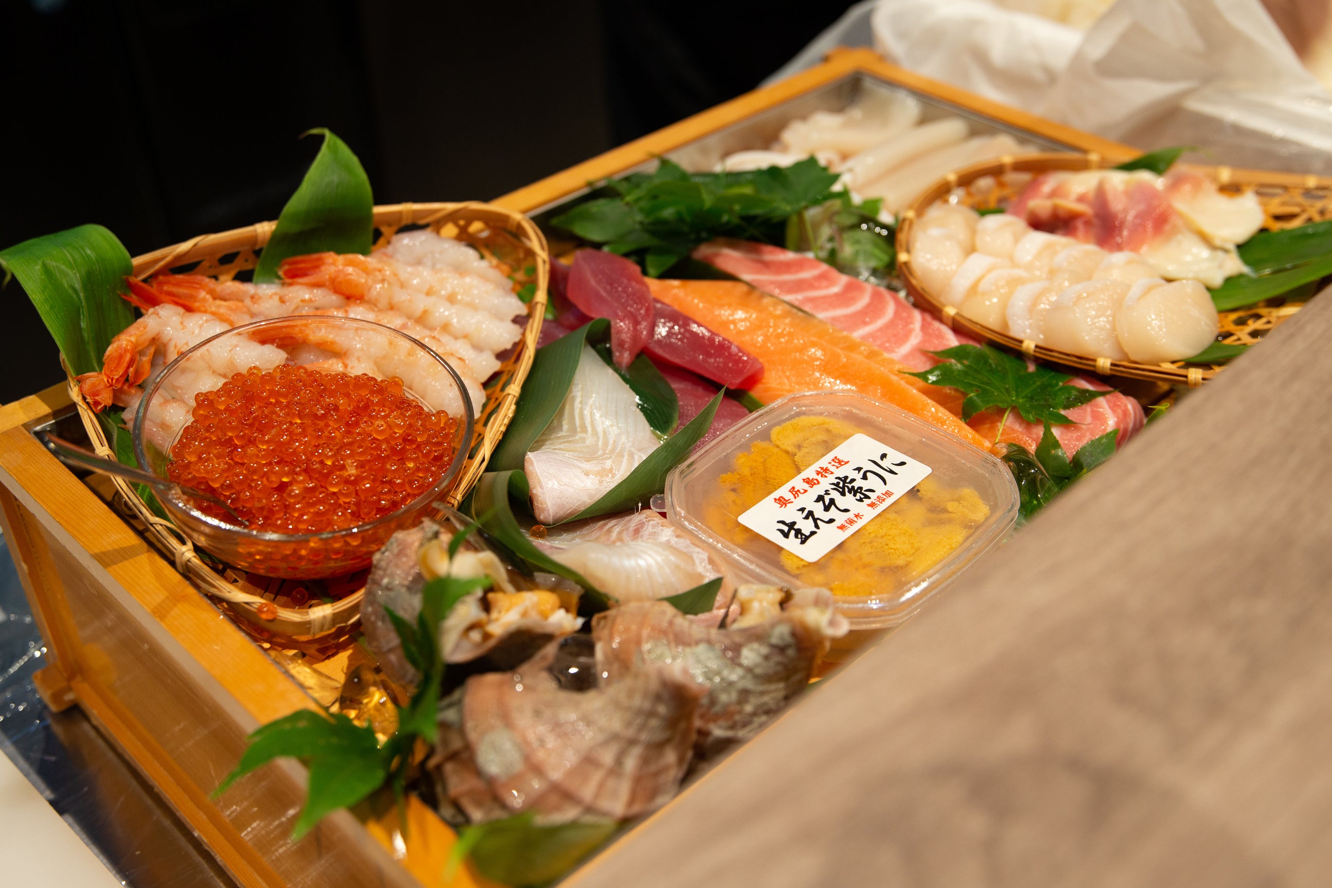 4〜6名様で50貫前後(1人前10貫程度)を提供いたします。北海道産米を使用したシャリに北海道産の帆立や北寄(ほっき貝)・タコ・平目などをはじめ、本鮪トロ・イクラ・ウニなどを味わっていただけます。