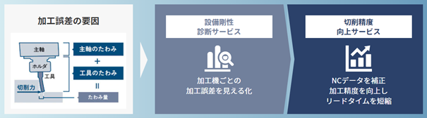 このたび提供を開始する剛性診断サービスは、切削(ミーリング)加工における加工誤差の原因の6割から7割を占める工具のたわみと接続部の変形度合いに関係する主軸剛性値を診断し、その結果をお客さまに提供するサービスです。