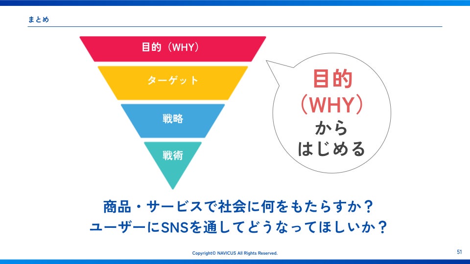 この目的を起点に、ターゲット設計・戦略・戦術へと落とし込むことで、成果に繋がる運用が可能になります。