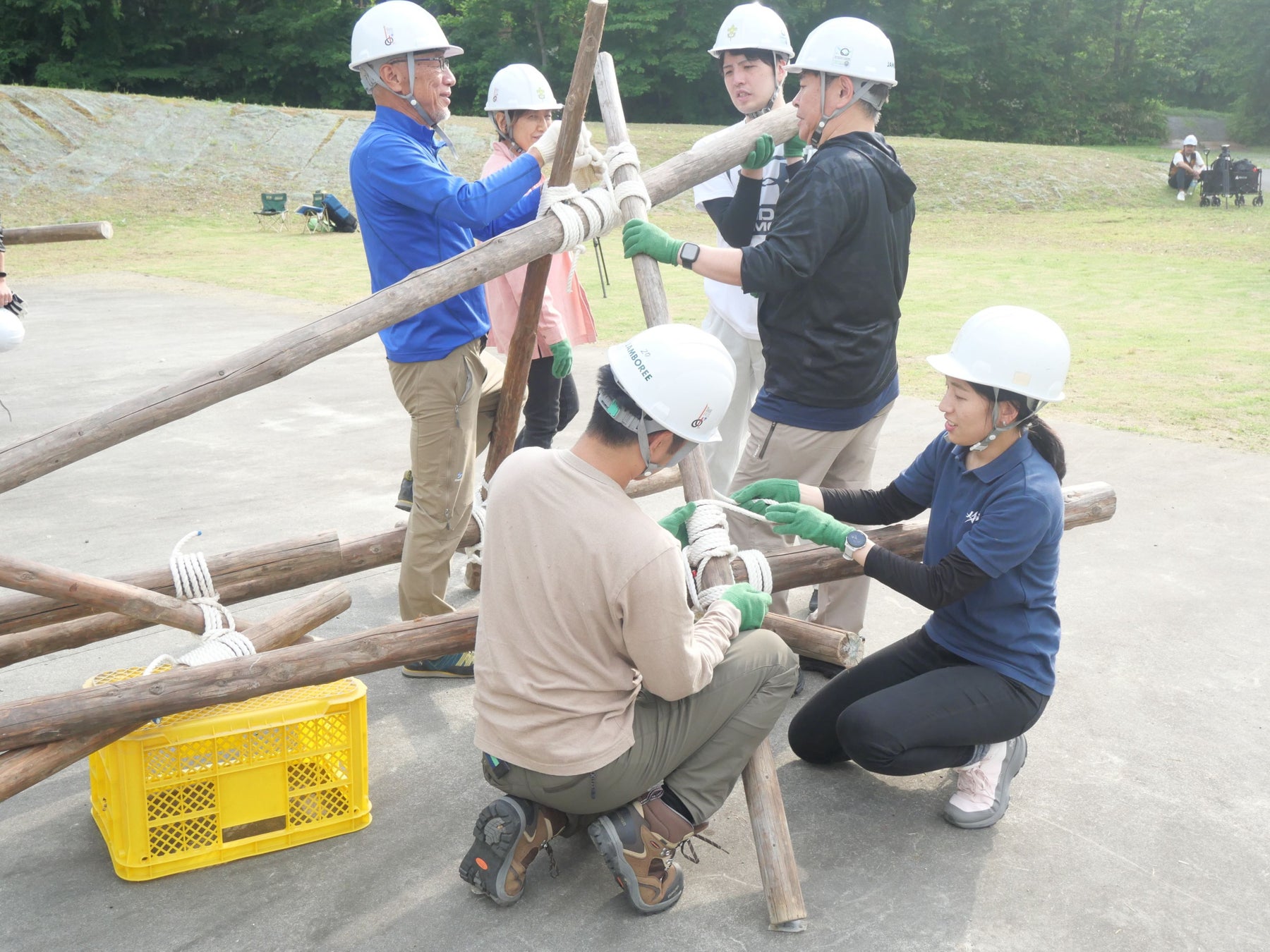 基礎研修はボーイスカウト日本連盟ご協力のもと、サバイバル環境で必要とされる着火・火起こしやロープ結びなどの知識習得のため、実践的な講義・実演訓練などがあります。具体的には、火起こしの仕方、地図の読み方、コンパスやナイフの使い方、安全な水の見分け方、身近なもので信号を送信する方法など野外活動に必要な技術を身に着ける訓練となります。野外訓練にて、丸太とロープを使い基地に見立てた信号塔の作成セッションに取り組み、4m以上になる大規模縛材を制作しました。製作過程の中で信号塔作成に足りない資材は自ら資材のある目的地まで地図・コンパス等を用いて向かい、目的を達成するためのリーダーシップ・チームワーク・コンフリクトマネジメントを習得しました。