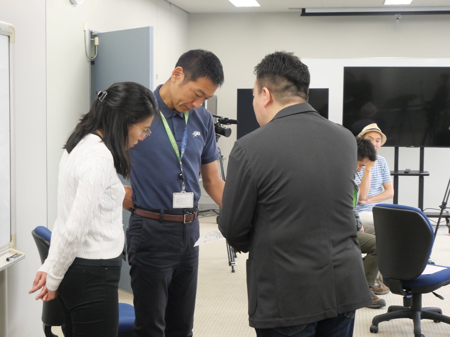 また、合意形成ワークショップは、演出家でワークショップデザイナーでもある洗足学園音楽大学准教授の田野邦彦先生と、星槎大学 共生科学部 客員教授 北川達夫先生ご協力のもと、演劇的手法を用いて多様な価値観やコミュニケーション上の困難性を持ち込み、合意形成の難しさやグループで協業する際に求められる非認知のスキルへの気づきを目的としていました。具体的には、宇宙飛行士候補者である米田あゆさんを班長、諏訪理さんを次長として、様々な属性を持つ複数人の班員とともにワークショップ内で与えられたミッションを遂行するプログラムを実施しました。本ワークショップ後に行った振り返りでは、諏訪理さんから「グループの中での立ち位置を常に意識しグループにいかに最も効果的な貢献できるかを考えておきたい」、米田あゆさんから「合意形成をとるにあたって、各人のやりたい事とその根底にある考えがどういうものなのかをクリアにすることが大切であると認識した」とコメントをいただきました。