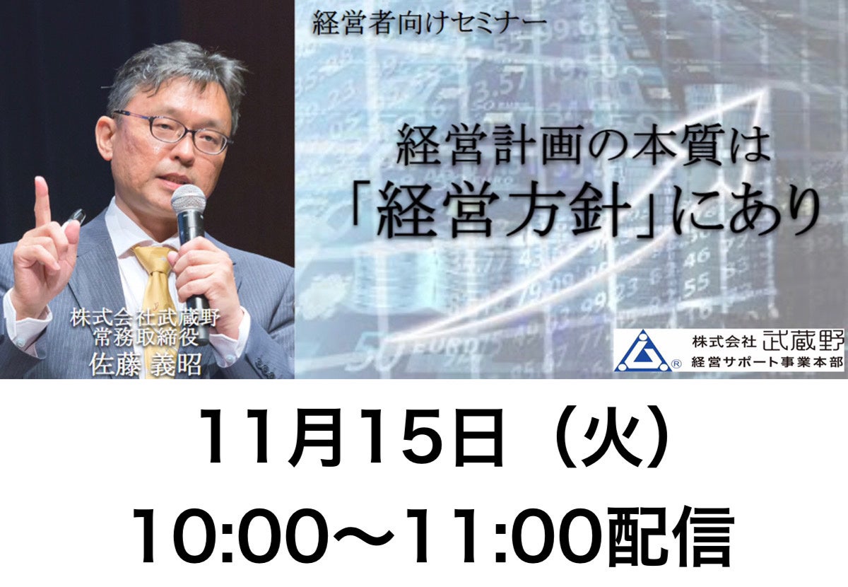株式会社武蔵野(東京都、小金井市、代表取締役社長:小山昇)は、経営者向け無料オンラインセミナー『経営計画の本質は「経営方針」にあり』を2022年11月15日(火)10:00から開催します(参加費無料)。昨年開催し、多くのご要望の声をいただき、今回の開催が決定いたしました。