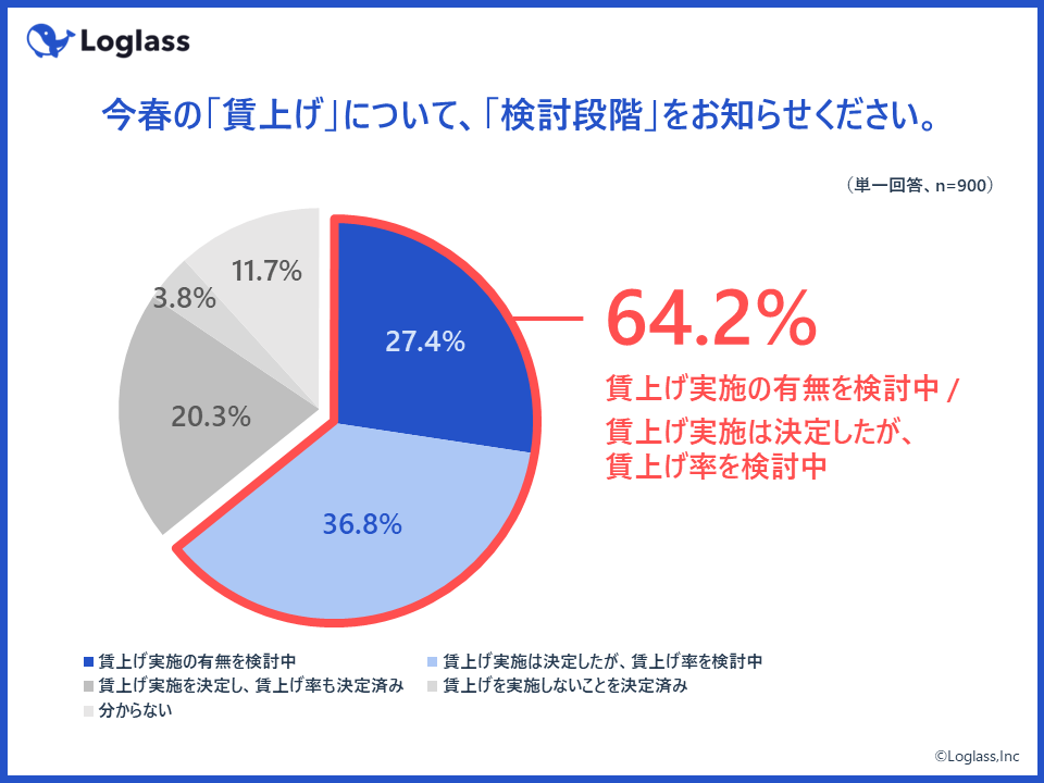 ・64.2%の企業が「賃上げ実施の有無/賃上げ率」について、未だ検討中の段階