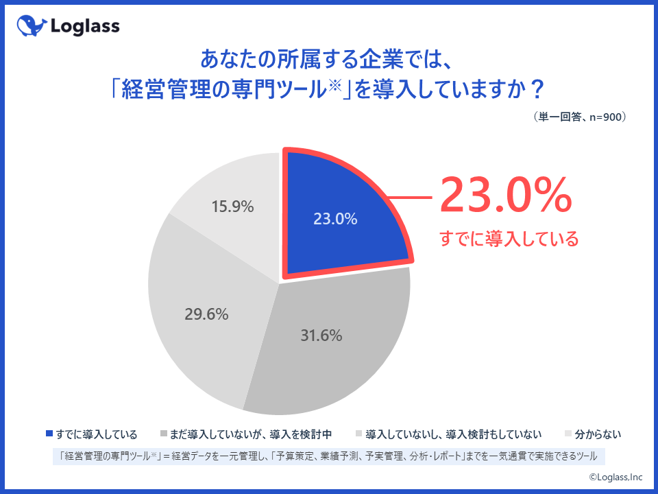 経営データを活用するためのツールである「経営管理の専門ツール(経営データを一元管理し、予算策定、業績予測、予実管理、分析・レポートまでを一気通貫で実施できるツール)」の導入状況を質問したところ、「すでに導入している」企業は全体の23.0%にとどまるという結果に。