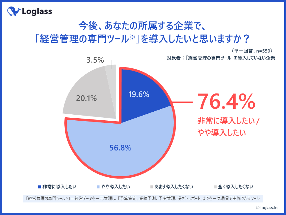 経営管理の専門ツールを「まだ導入していない」企業に、今後の導入意向を質問したところ、約8割(76.4%)が「導入したい」と回答。高いニーズがあることが確認された。
