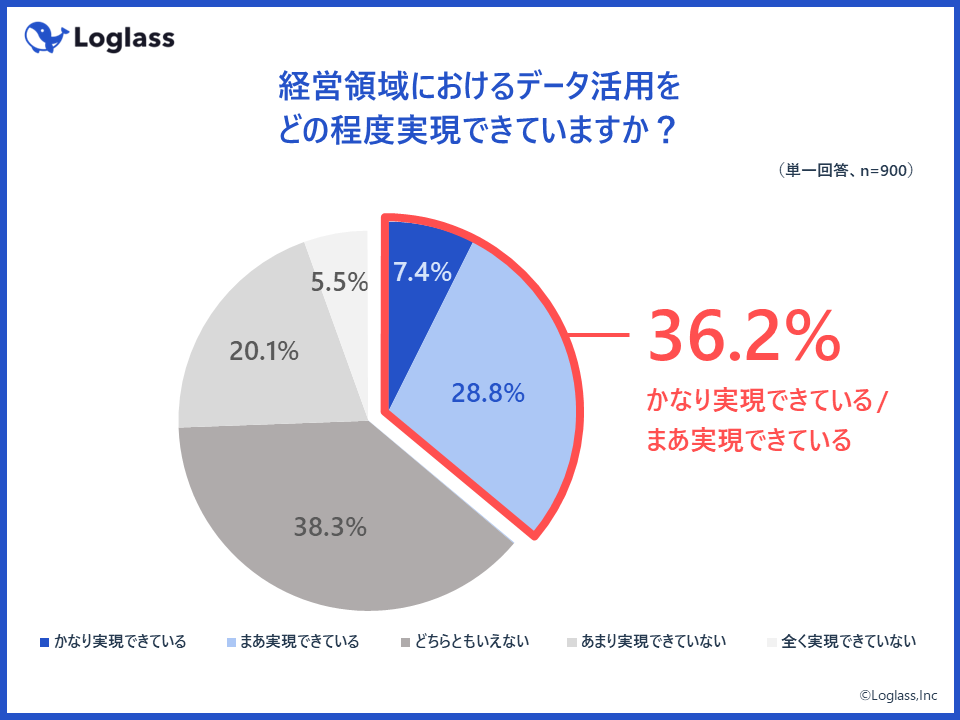 一方で、経営領域におけるデータ活用を「実現できている」企業は、全体の36.2%にとどまる。また、「かなり実現できている」企業は、わずか7.4%という結果に。