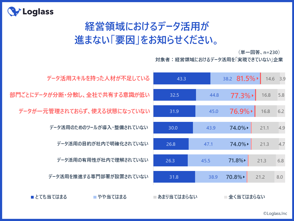 続いて、経営領域におけるデータ活用が進まない要因を質問したところ、第1位は「データ活用スキルを持った人材が不足している(81.5%)」、第2位は「部門ごとにデータが分断・分散し、全社で共有する意識が低い(77.3%)」、第3位は「データが一元管理されておらず、使える状態になっていない(76.9%)」という結果に。