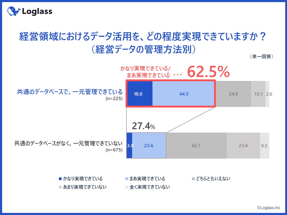 次に、経営データの管理方法の違いによって、経営領域におけるデータ活用の実現度に差があるのかを分析した。すると、経営データ(財務データ※2、非財務データ※3)を「共通のデータベースで、一元管理できている」企業では、経営領域におけるデータ活用を「実現できている」割合が62.5%であるのに対し、「共通のデータベースがなく、一元管理できていない」企業においては、同スコアが27.4%という結果となり、2倍以上のスコア差が存在。経営データを共通のデータベースで一元管理できているかどうかが、経営領域におけるデータ活用の実現度を左右する重要ファクターであることが確認された。