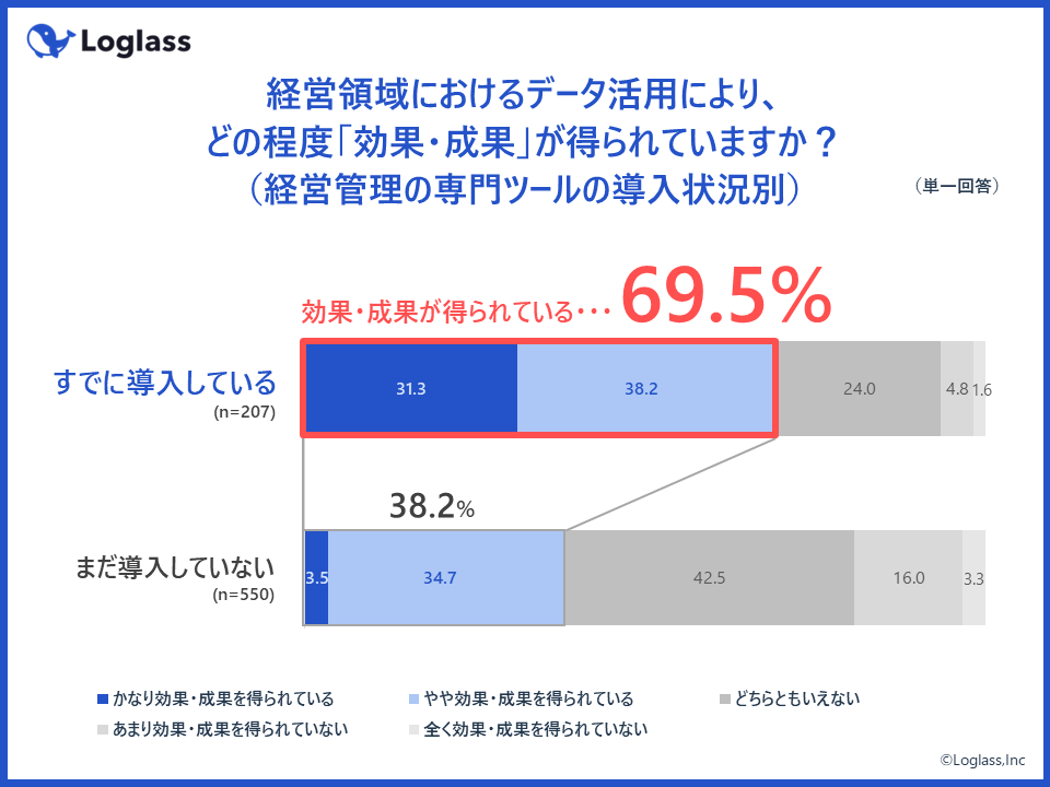 経営管理の専門ツールを「すでに導入している」企業では、約7割(69.5%)が経営領域におけるデータ活用の効果・成果を実感。一方で、「まだ導入してない」企業では、同スコアが約4割(38.2%)にとどまっている。