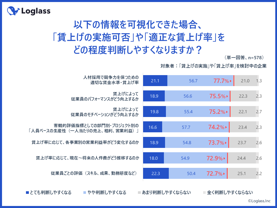 続いて、今後「賃上げの実施可否/適正な賃上げ率」を判断する際に利用したいツールについて質問したところ、第1位は「人材採用で競争力を保つための、適切な賃金水準・賃上げ率を可視化できるツール(76.4%)」、第2位は「従業員ごとの評価(スキル、成果、勤務態度など)を可視化できるツール(76.0%)」、第3位は「賃上げによって、従業員のモチベーションがどう向上するかシミュレーションできるツール(75.7%)」という結果に。他の項目に関しても7割以上の高いスコアを示しており、「賃上げの判断に役立つ情報を可視化するツール」に対して、高いニーズがあることが確認された。