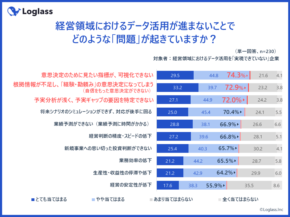 次に、経営領域におけるデータ活用が進まないことで、どんな問題が起きているかを質問したところ、第1位は「意思決定のために見たい指標が、可視化できない(74.3%)」、第2位は「根拠情報が不足し、経験・勘頼みの意思決定になってしまう(自信をもった意思決定ができない)(72.9%)」、第3位は「予実分析が浅く、予実ギャップの要因を特定できない(72.0%)」という結果に。