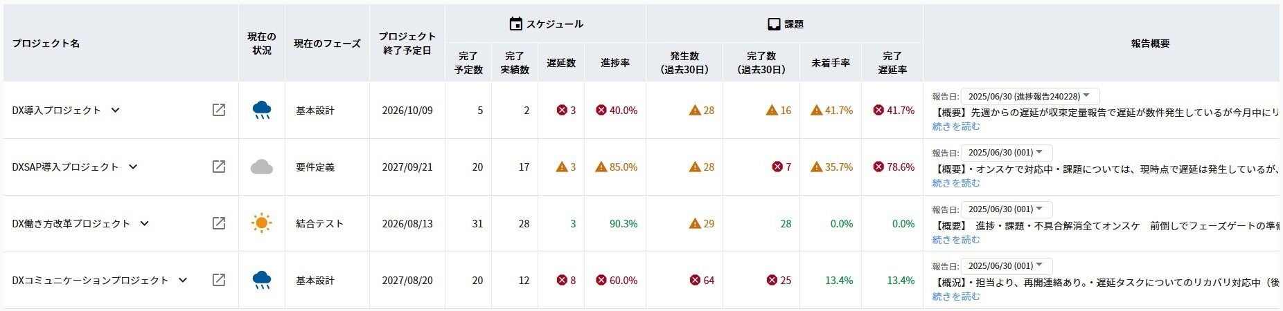 これにより、「このプロジェクトは雨マークになっているから状況を確認しよう」といった対応がスムーズになりました。