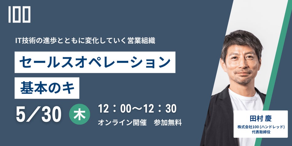 HubSpot CRMの導入と運用支援サービスを通じてRevOpsソリューションを提供する株式会社100(ハンドレッド、本社:東京都世田谷区、代表取締役:田村 慶)は、2024年5月30日(木)12時から「セールスオペレーション 基本のキ 〜IT技術の進歩とともに変化していく営業組織〜」をテーマにオンラインセミナーを開催いたします。