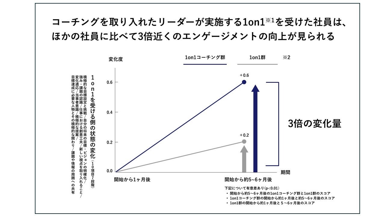 1on1の本来の目的に即して、上司と部下が、共にどんな変化を創れるかを探索するコミュニケーションを目指すには、お互いの間に「問い」を置き、新しいアイデアや価値を共創するコーチングのアプローチが有用だと私たちは考えています。実際、コーチングの成果や機能のメカニズムの研究を行っている、当社の研究機関「コーチング研究所」でも、コーチングを取り入れた1on1が部下のエンゲージメントの向上に成果を生んでいることを確認しています。