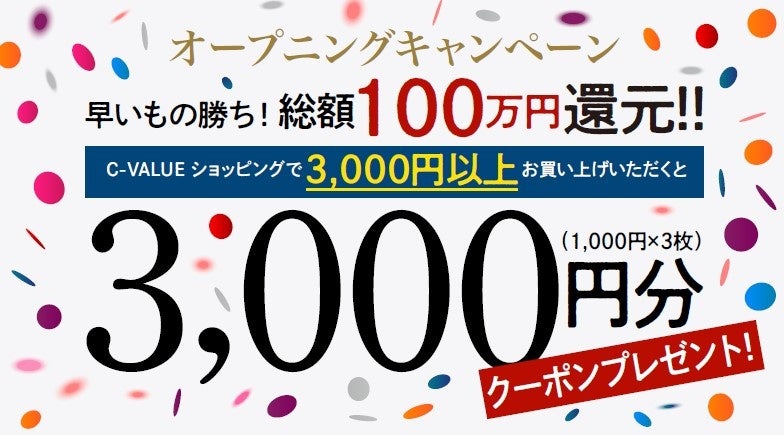 内容:C-VALUEショッピングでの総額3,000円(税込・送料別)以上のお買い上げで3,000円分(1,000円×3枚)の電子クーポンコードをプレゼント ※先着334名さま限定