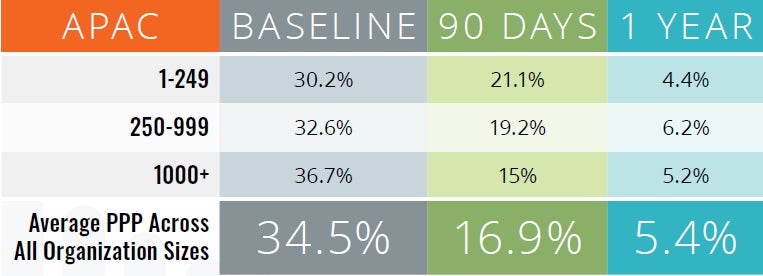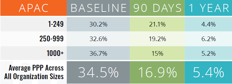 ベースラインベンチマーキング後に継続的なトレーニングと模擬フィッシング訓練/フィッシング攻撃テストを組み合わせて実施した場合、驚くべき改善が見られました。90日間のKnowBe4のトレーニングとフィッシング演習の結果、全世界の平均PPPスコアは、32.4%%から17.6%へとほぼ半減しています。その後、1年間にわたりフィッシングテストと継続的なトレーニングを実施することで、このPPPスコアは大幅に改善され、5%までに減少しています。これは、KnowBe4のトレーニングとフィッシング演習が新しい行動習慣を常態化し、より強固なセキュリティカルチャーを醸成していることを示す注目すべき成果です。