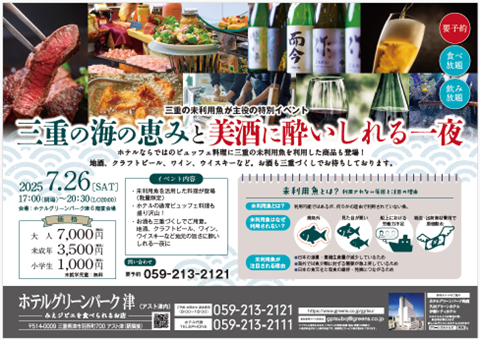 株式会社グリーンズ(本社:三重県四日市市、代表取締役社長:村木雄哉、証券コード:6547)は、2025年7月26日(土)に、運営するホテルグリーンパーク津(津市羽所町)にて、地域共創型の食イベント「三重の海の恵みと美酒に酔いしれる一夜」を開催いたします。