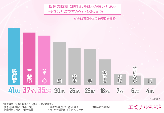 そこで今回、医療脱毛を手掛けるエミナルクリニック(https://eminal-clinic.jp/lp01/?refmedia=11073)は、20代〜30代の女性を対象に「秋冬に脱毛したい部位」に関する調査を実施しました。
