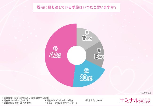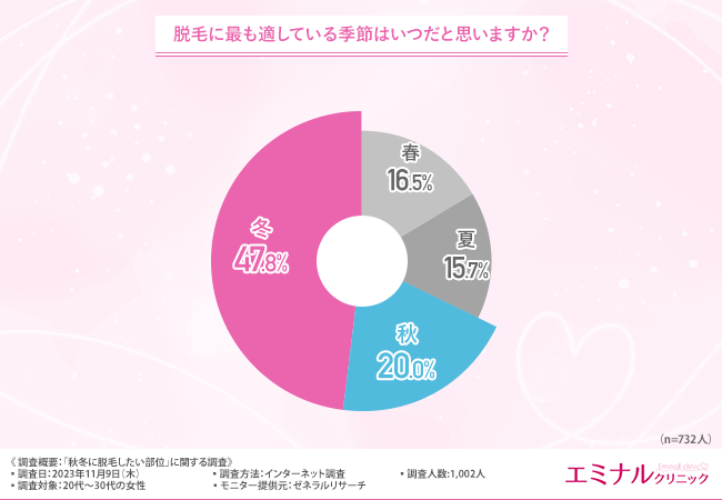 今回の調査で、およそ7割の方が脱毛に適した季節は秋冬だと考えていることが明らかになりました。