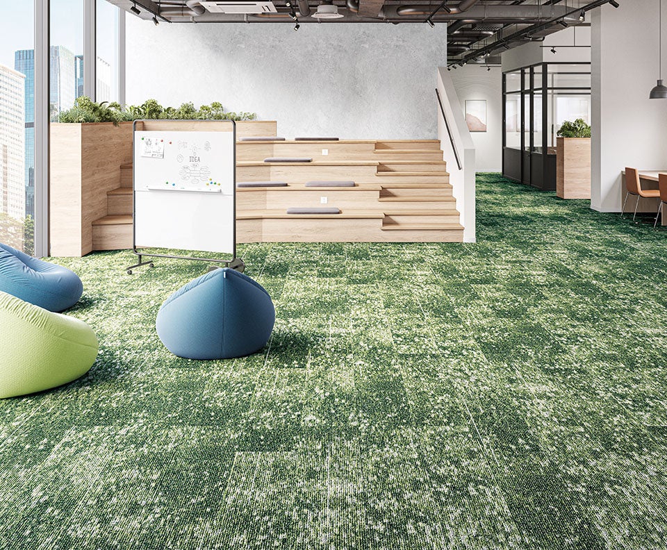 原着ナイロンカーペットタイルと比較しコストを低く抑えながらも、バイオフィリックデザインを取り入れた柄や、トレンドを反映した商品を収録