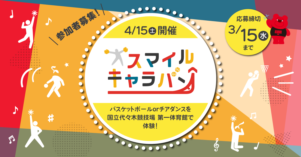 トヨタアルバルク東京株式会社(以下、アルバルク東京)と損害保険ジャパン株式会社(以下、損保ジャパン)と株式会社KINTO(以下、KINTO)は、2023年4月15日(土)に国立代々木競技場第一体育館(以下、代々木第一体育館)において、小学生を対象とした「スマイルキャラバン」を開催します。