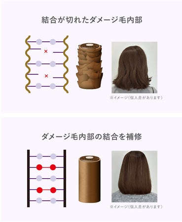 髪のエイジングやカラー、パーマ、紫外線などで、スカスカに切れてしまったダメージ部位のケラチン構造を補修する先進ペプチド「ボンディングペプチド*2」と、毛髪にうるおいを閉じ込め、開いたキューティクルを再接着する「ピノプレックス*3」という成分を日本で初めて配合*1しました。