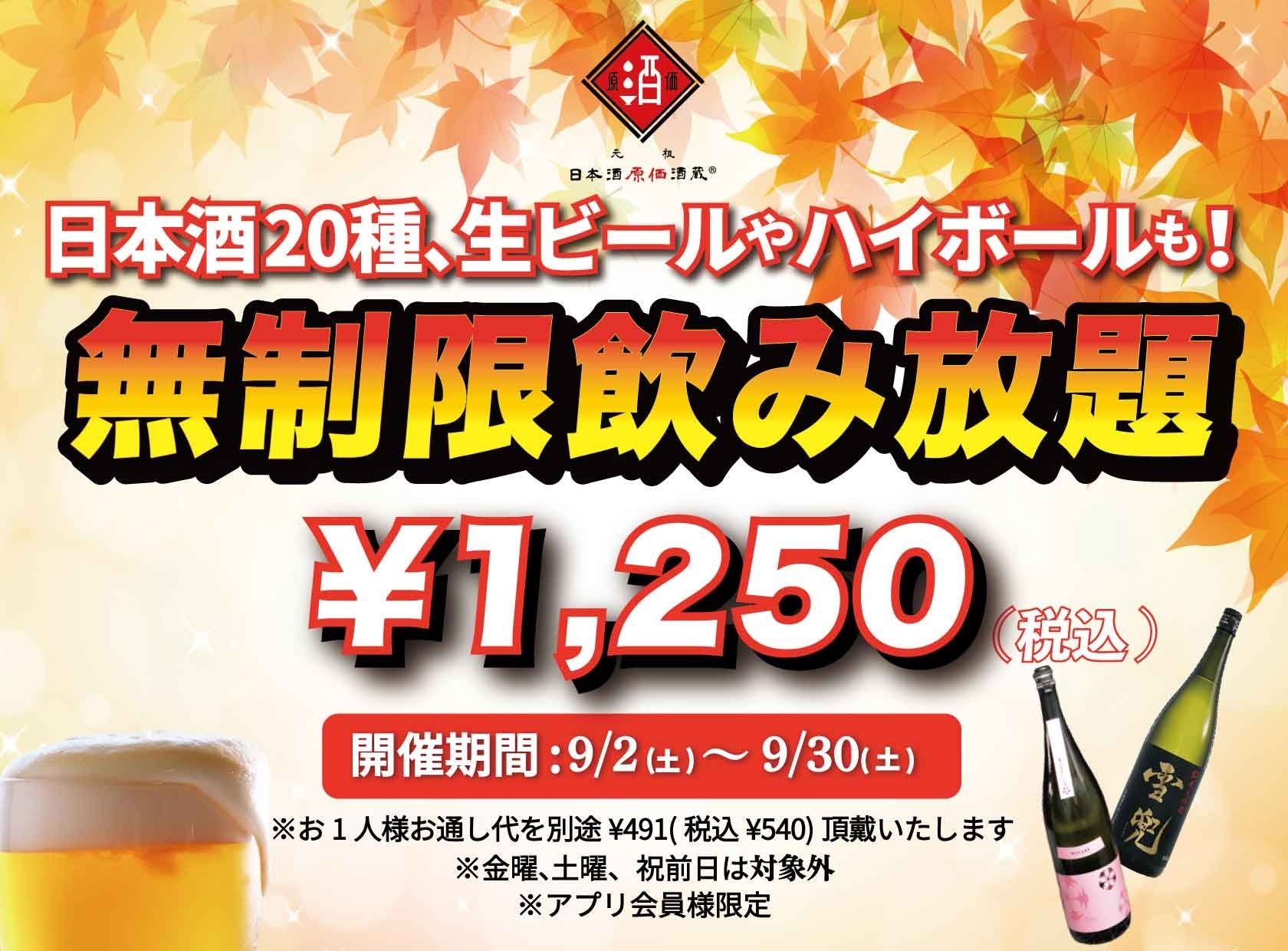 9月2日(土)~9月30日(土)に日本酒原価酒蔵全店にて時間無制限飲み放題¥1,250(税込)を開催します。