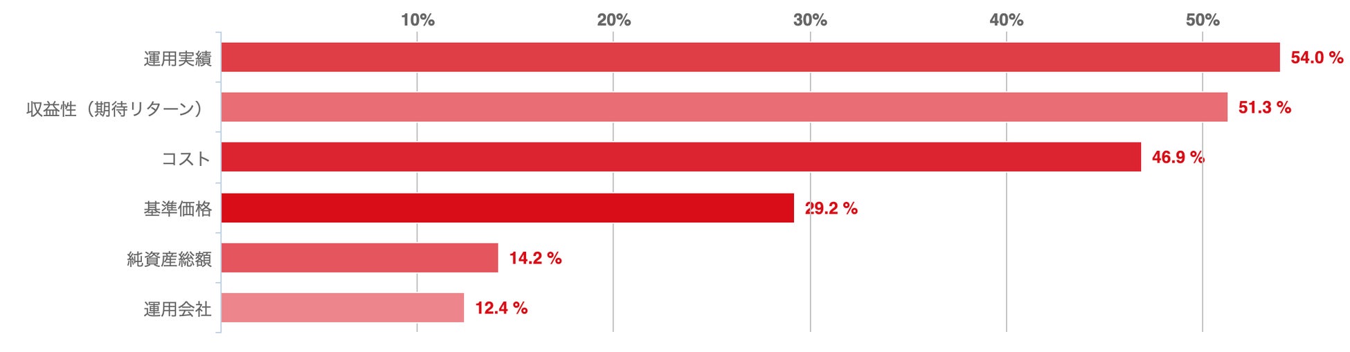 また、「基準価格(29.5%)」や「純資産総額(13.4%)」も一定の考慮に入れられており、「運用会社の信頼性」についても12.5%の回答者が重要視している。