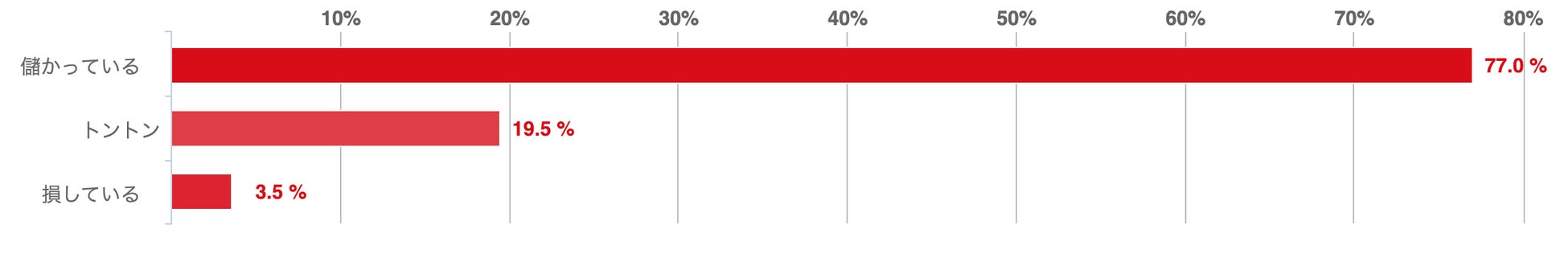 アンケートによれば、「儲かっている」が76.8%と大多数を占めている。一方で、「トントン」、すなわち損失と利益が相殺されている人は19.6%、「損している」人は3.6%に留まった。