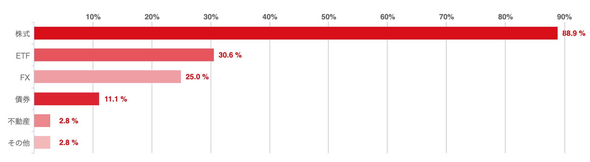 アンケートによれば、「株式」に投資している人の割合が88.9%で圧倒的に高く、これに「ETF(30.6%)」と「FX(25.0%)」が続く形となった。