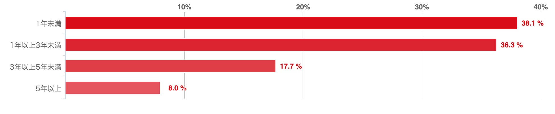 アンケートによれば、20代の投資信託の運用経験は「1年未満」が最も多く、全体の38.4%を占めている。続いて「1年以上3年未満」が35.7%となっており、運用経験が3年未満の初心者が多いことが読み取れる。