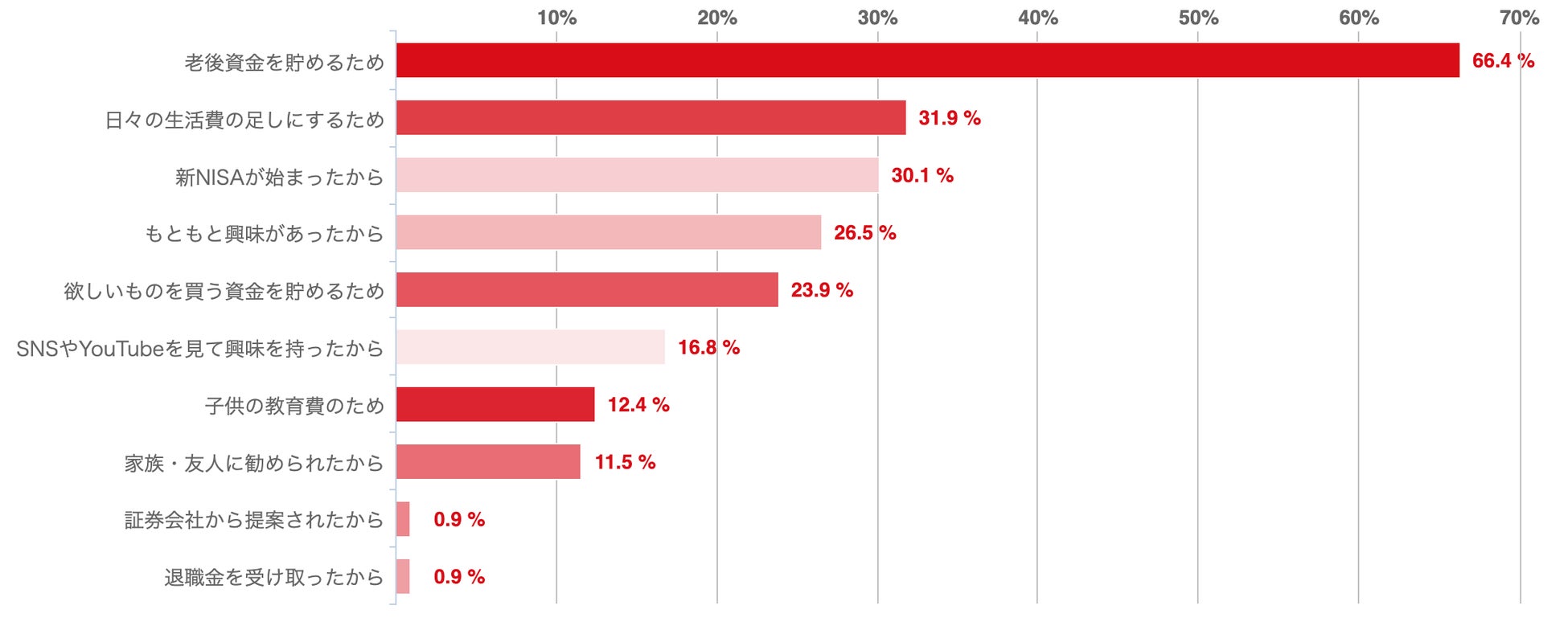 次いで、「日々の生活費の足しにするため(32.1%)」と「新NISAが始まったから(30.4%)」を理由に挙げた回答者も多くなっている。さらに、「SNSやYouTubeを見て興味を持った」20代も、17.0%と一定数いることがわかった。
