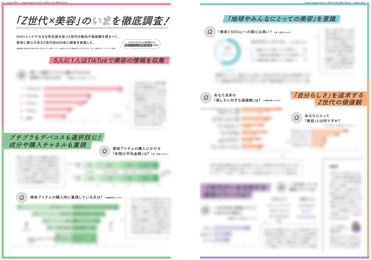 この度発行した「ampule magazine Vol. 4」のテーマは、「Z世代からみた 世界とBeauty」です。コロナ禍に多感な時期を過ごし、未来の消費とトレンドを牽引する「Z世代」。SNSを駆使した情報収集や評判を重視する購買傾向、「自分らしさ」を追求する価値観など、彼らの美容に対する意識を徹底調査しました。さらに、当事者であるZ世代の起業家やクリエイター、ギャルマインド伝道師など、4名のイノベーターへのインタビューから、「Z世代の今」に迫ります。