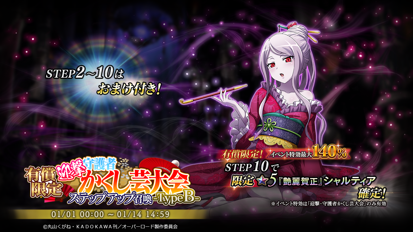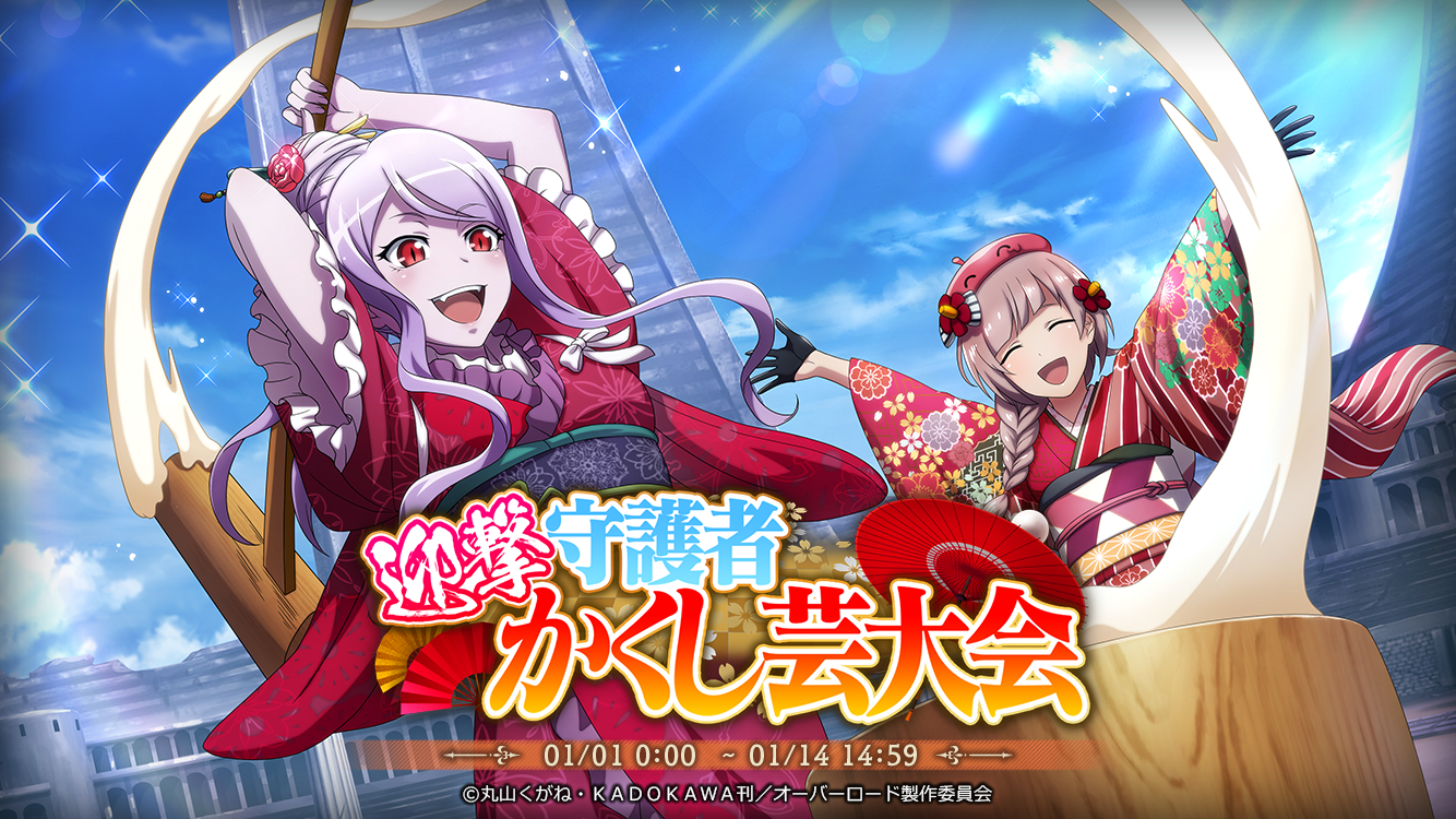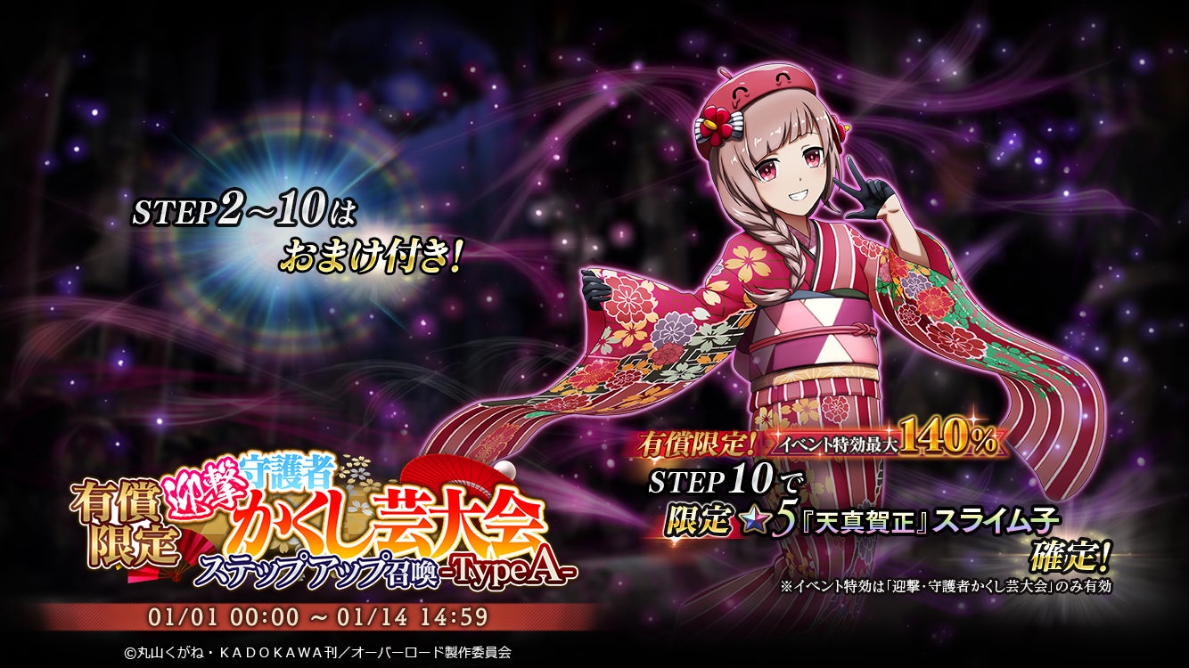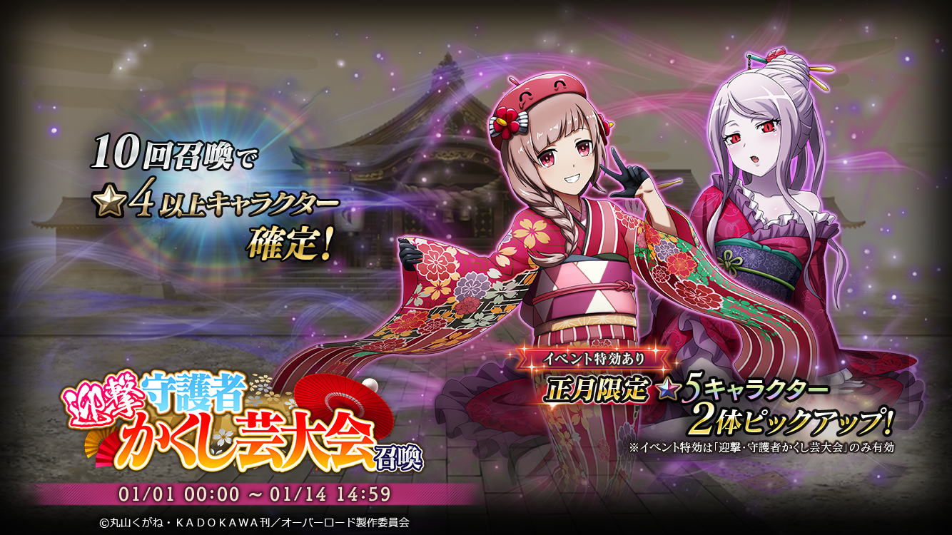 1/1より新年イベント『[迎撃・守護者かくし芸大会』を開催!晴れ着姿のキャラクター達が登場する、本年1回目のイベントです!イベント連動の召喚では『 【天真賀正】スライム子』『【艶麗賀正】シャルティア』が登場!お得なパックの初売りも同時開催!