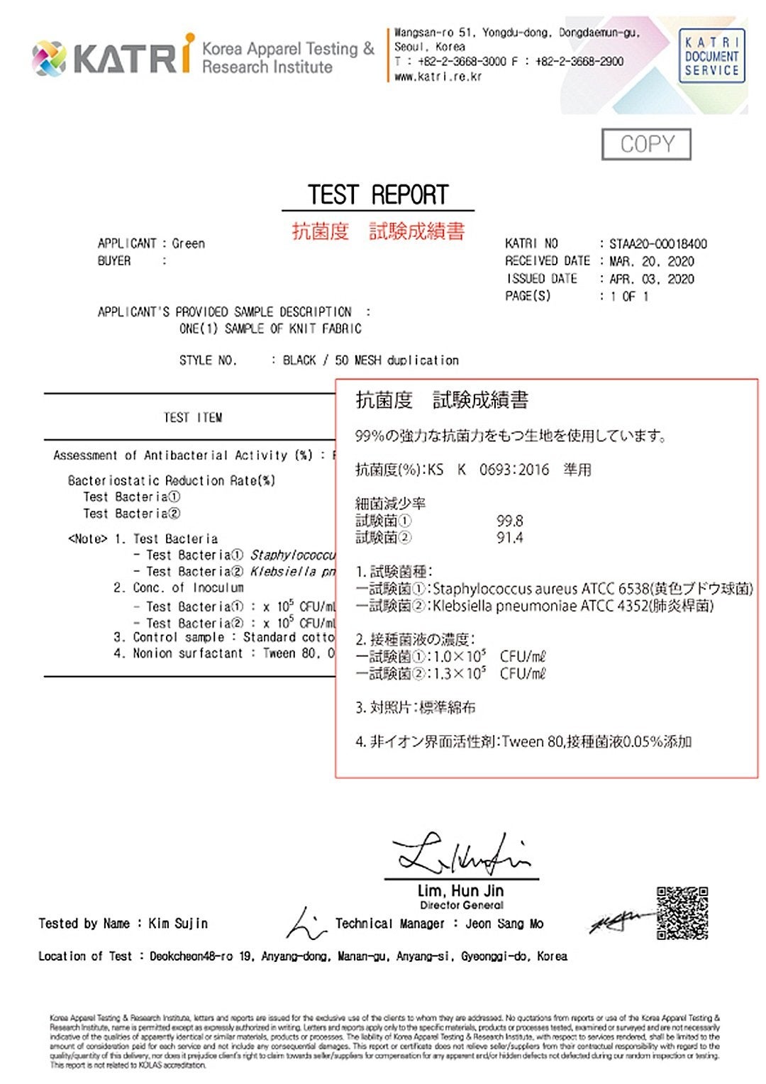 ※一般社団法人 繊維評価技術協議会(JTETC)が定めた抗菌防臭機能に対する承認基準を達成。SEK認証済み。