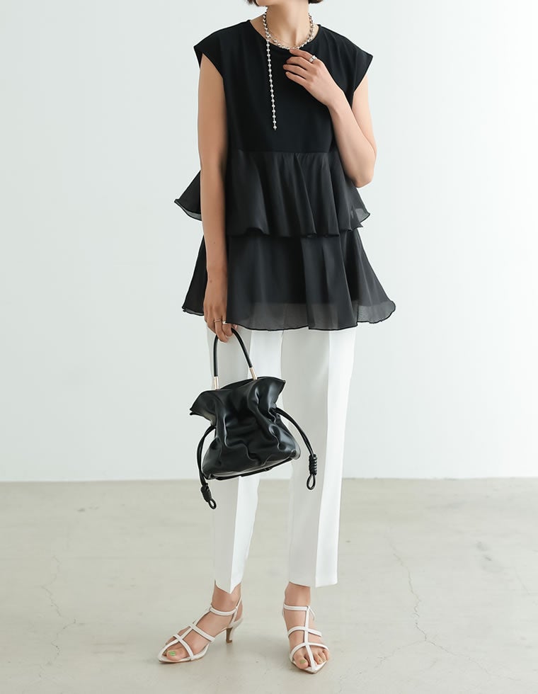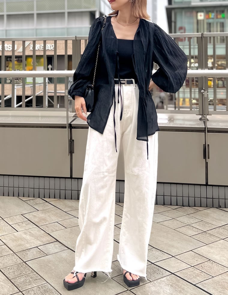 フリル部分は、シアー感のある異素材になっていることで単調になりすぎずトレンドライクな印象に。