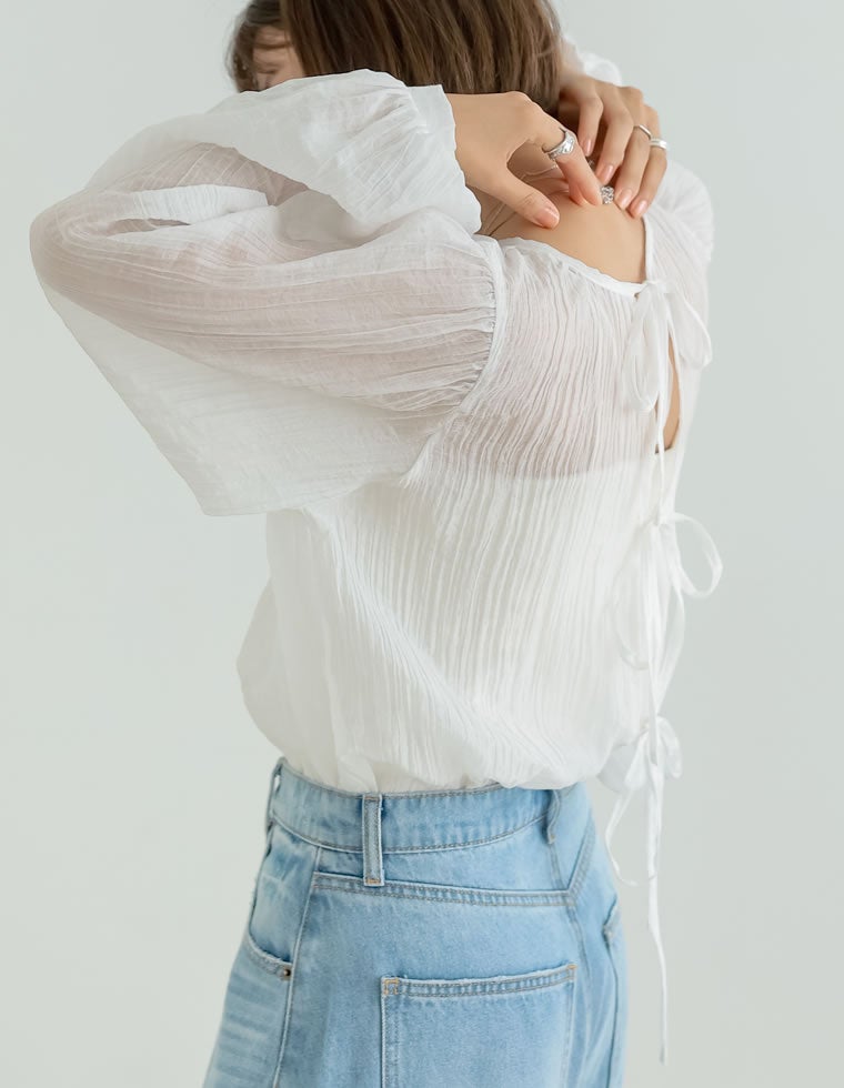 リボンを後ろにして、バックシャンなブラウスとしてはもちろん、羽織リとしても着こなせる、着回し力に優れた1着。
