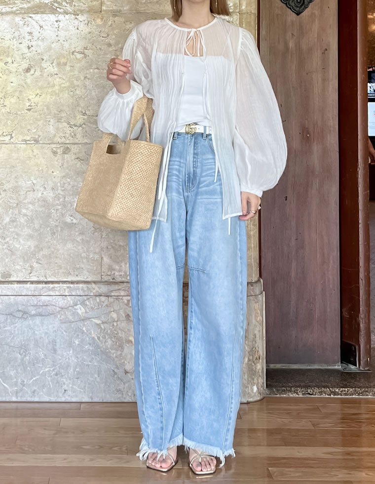 夏の羽織りとしても、初夏のデザイントップスとしても着まわせ、ロングシーズンお楽しみいただけるシアーシャツです。