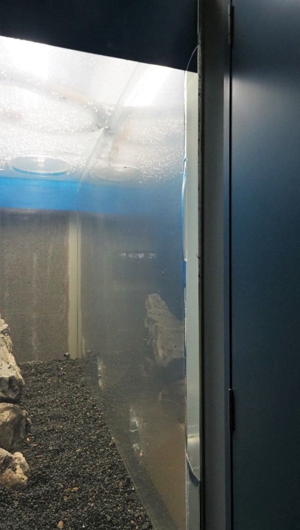 3月2日(木)17時頃、水族展示室のふれあい体験室(令和4年1月8日から閉鎖中)における水槽の日常点検を行っていたところ、ふれあい水槽の左側に亀裂が入っていることを確認しました。水漏れはなく、破断にも至っていません。原因については、現在調査中です。