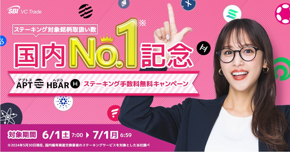 SBI VCトレード株式会社(本社:東京都港区、代表取締役社長:近藤 智彦、以下「当社」)は、2024年6月1日(土)より、「【ステーキング対象銘柄取扱い数 国内No.1記念】アプトス(APT)・ヘデラ(HBAR)ステーキング手数料無料キャンペーン」を実施することをお知らせいたします。