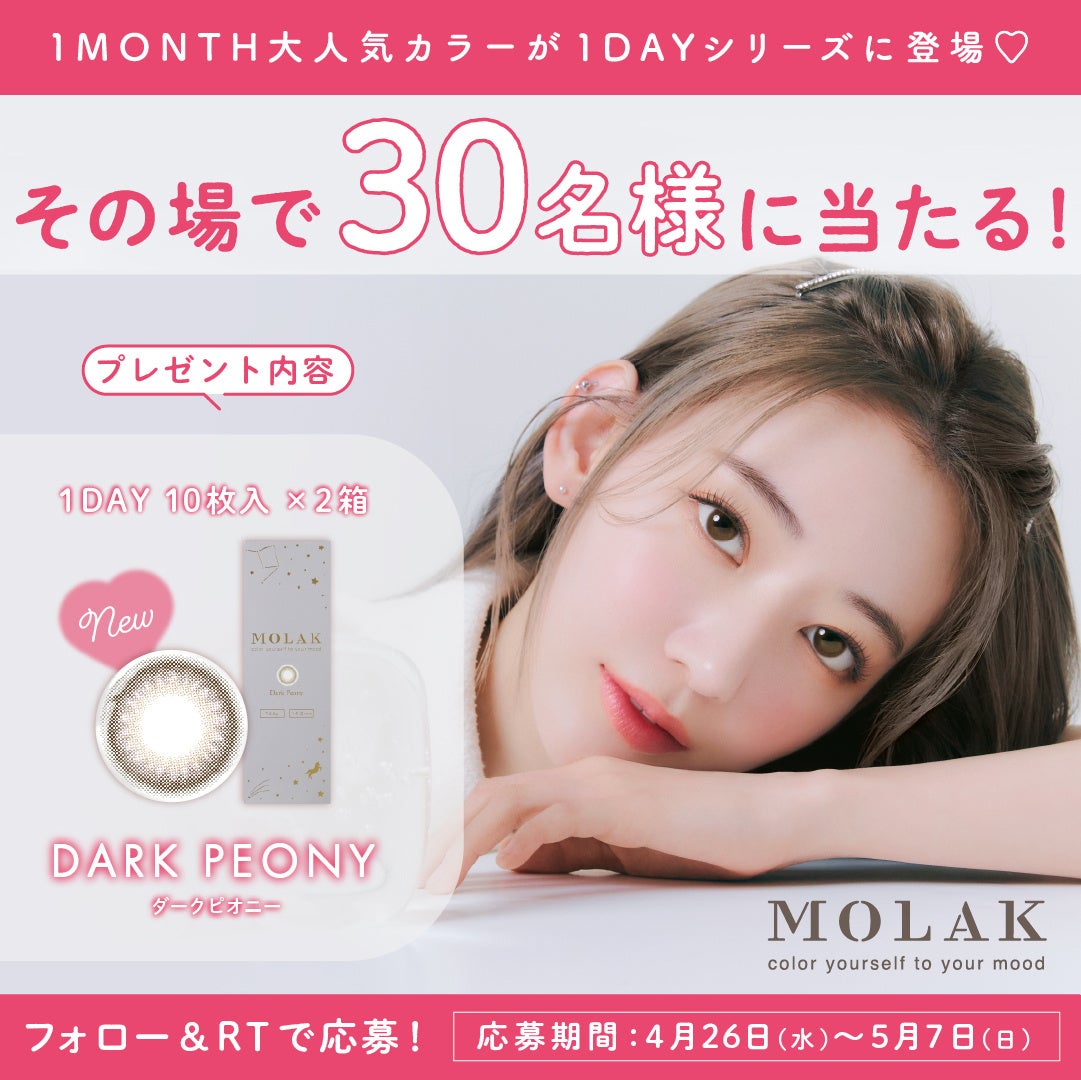 「Dark Peony 1DAY(ダークピオニー ワンデー)」の発売を記念して、MOLAK公式Twitterにて抽選で30名様に「Dark Peony 1DAY」が当たるプレゼントキャンペーンを実施いたします。