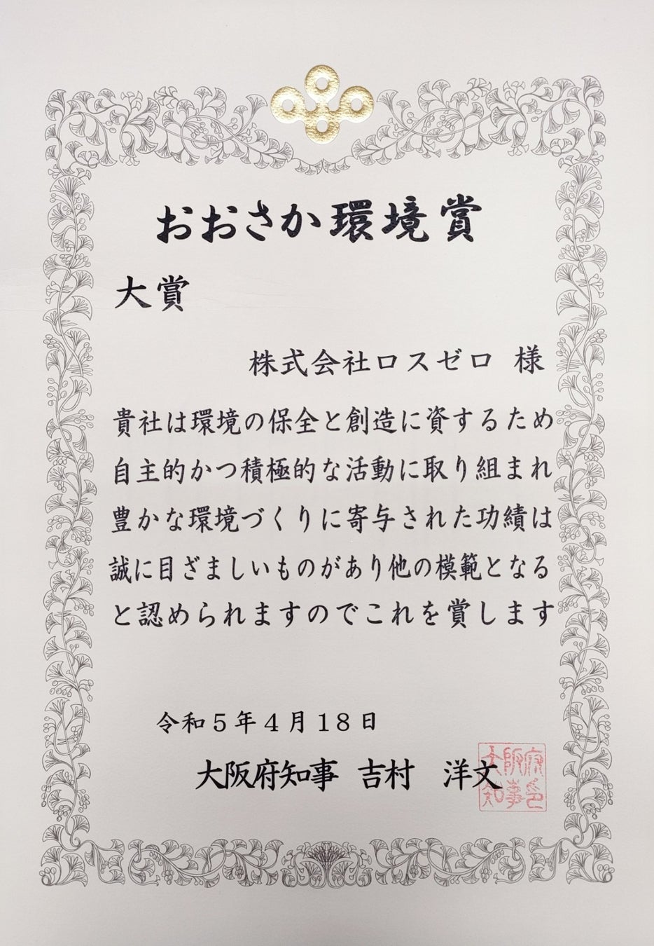 もったいない食品を活かし、エシカルな消費スタイルを創造する株式会社ロスゼロ(大阪市西区、代表 文美月)は令和4年度「おおさか環境賞」大賞を受賞し、4月18日に執り行われた表彰式に出席致しました。式では吉村洋文大阪府知事より表彰状を受け、懇談にて大阪・関西万博に向けた食品ロス対策をお聞きしました。