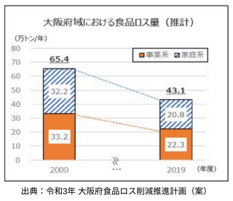 国が目指す2030年までに2000年度比で食品ロス量の半減を踏まえ、大阪府でも事業系、家庭系食品ロスともに半減を目指しています。事業系食品ロスの取り組みとして、「おおさか食品ロス削減パートナーシップ制度」の推進や「フードバンクガイドライン」の活用を促す他、家庭系食品ロスにおいてはリーフレットを通じた啓発活動や、大学やパートナー企業と連携し、イベントを開催することで食品ロス削減に関する認知度向上を目指しています。