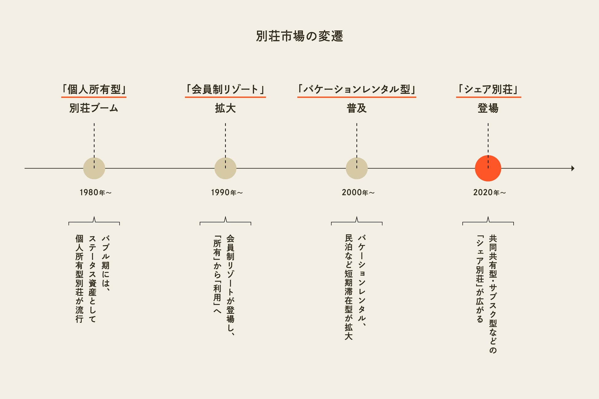 “所有”から“共有(シェア)”へと価値観が移る中で、別荘の持ち方も変化しています。別荘市場の変遷を辿ると、「所有型」から「会員制」「バケーションレンタル」、そして「サブスクリプション型」「共同所有型」へと、利用形態の多様化が進んでいます(図参照)。その背景には、モノではなく〈体験〉や〈関係性〉を重視するライフスタイルへのシフトがあると考えられます。