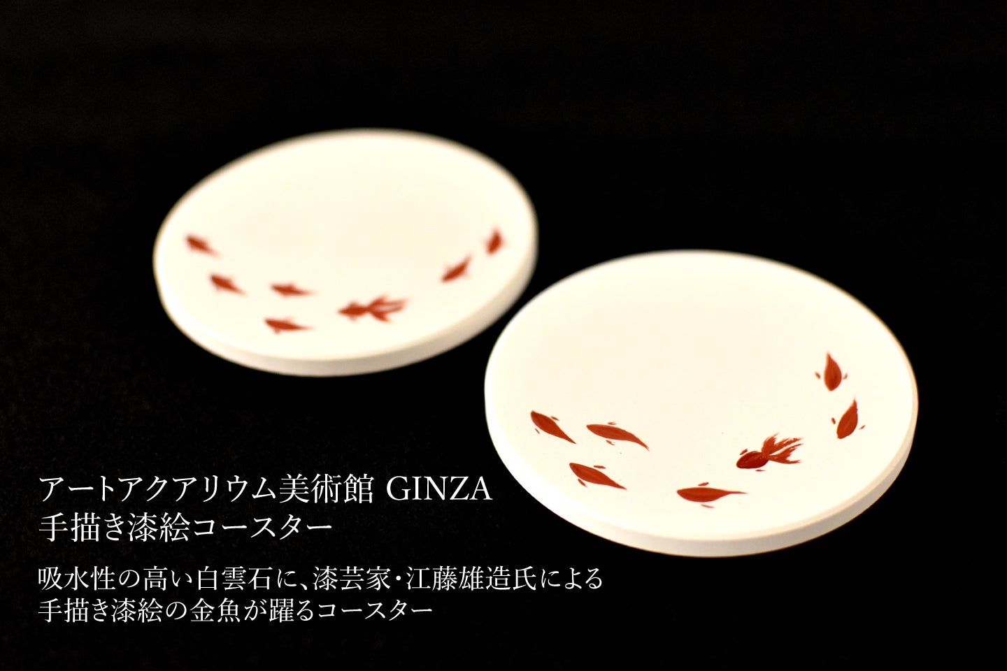 ブランチプランでは、当館オリジナルの金魚コースターをプレゼントいたします。吸水性の高い白雲石に、漆芸家・江藤雄造氏による手描き漆絵の金魚が踊るコースターです。