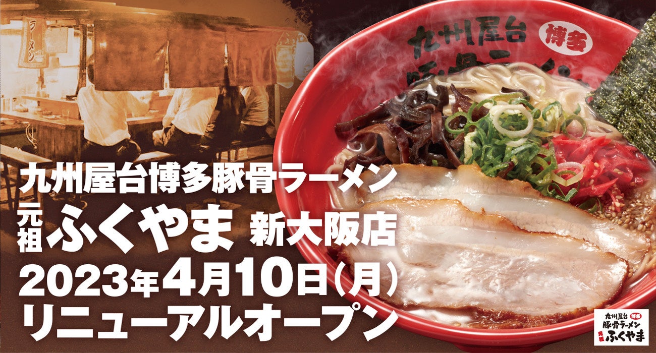 ワンズトライン株式会社(本社:大阪市北区芝田2丁目3番16号、代表取締役:山内仁)が運営する「九州屋台博多豚骨ラーメン元祖ふくやま 新大阪店」(住所:大阪市淀川区西中島7-2-15、TEL:06-6829-6223)が、'23年4月10日(月)にリニューアルオープンいたします。