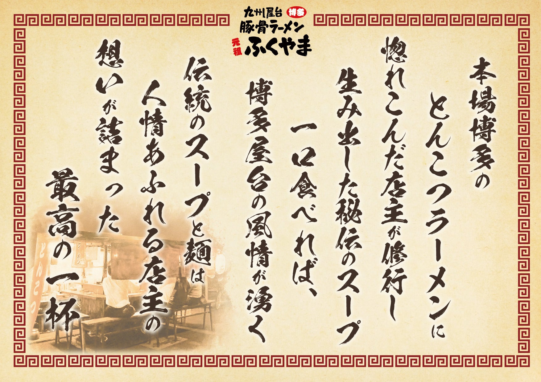 本場・博多とんこつラーメンの伝統の味をベースに、研究を重ねて生み出した濃厚スープと細麺の絶妙なバランスが多くの方に支持されている『ふくやま』のラーメン。