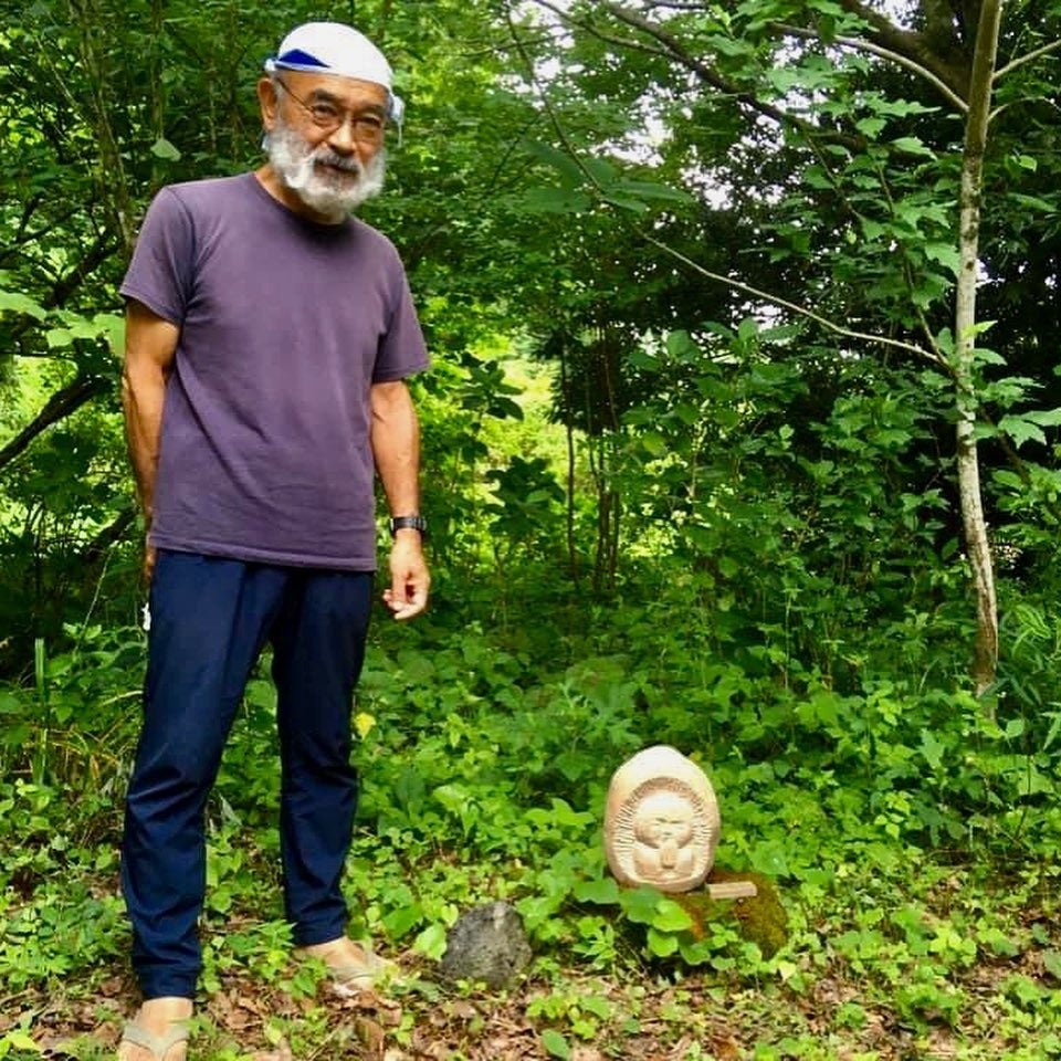 ⼟屋誠⼀さんは1950年 静岡県⾦⾕町(現島⽥市)⽣まれで、サンドブラスト作家として活動を始めたものの機械的な物づくりに疑問を感じ、⽴体的で精神的な作品に憧れ、⼿彫りの⽯彫刻を始めました。
