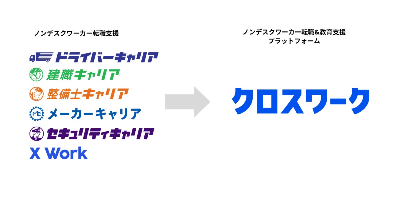 今回のリブランディングでは、これらのサービスを統合し、ノンデスク産業全域を支援する人材採用プラットフォーム「クロスワーク」として新たに生まれ変わります。